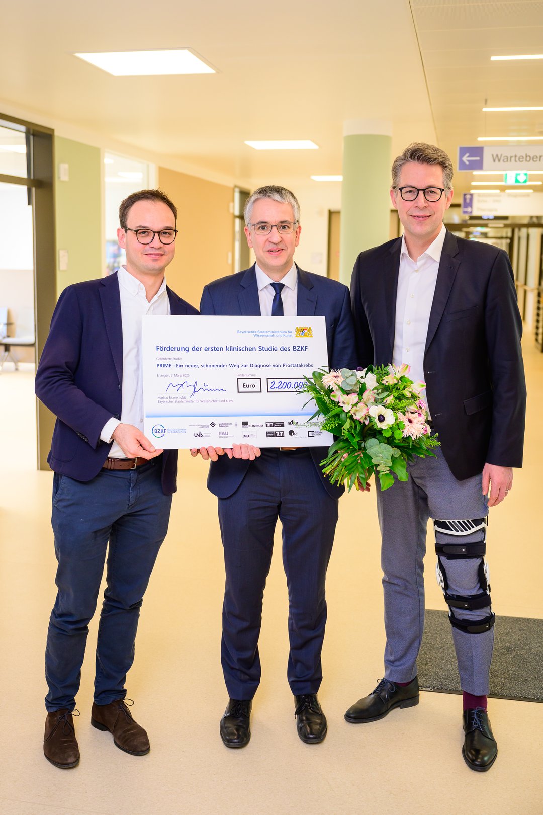 Wie sich Prostatakrebs pr?ziser und damit schonender für Patienten erkennen l?sst, untersucht eine klinische Studie der Universit?tsmedizin Augsburg, die vom Bayerischen Zentrum für Krebsforschung (BZKF) mit 2,2 Millionen Euro gef?rdert wird. Dr. Matthias Heck, Professor für Urologie, und Prof. Dr. Matthias Eiber, Leiter der Sektion Theranostik des Klinikums der Technischen Universit?t München (TUM), leiten die Studie, die bis Ende 2030 l?uft. Prostatakrebs ist eine der h?ufigsten Krebsarten bei M?nnern. Bislang folgt bei einem erh?hten PSA-Wert im Blut und einer auff?lligen Kernspintomographie meist eine Gewebeentnahme (Biopsie). Für viele Betroffene ist diese Untersuchung eine gro?e k?rperliche und psychische Belastung – unangenehm, schmerzhaft und mit m?glichen Infektionen verbunden. Nicht selten werden dabei zudem harmlose Befunde erhoben, die keiner Behandlung bedürfen.? In der PRIME Studie soll nun geprüft werden, ob eine zus?tzliche moderne Bildgebung (Positronen-Emissions-Tomographie, PET)/Computertomographie, CT) die Diagnose weiter verbessern kann. Mit dem PSMA-PET/CT kann man Prostatakrebszellen durch eine sehr geringe Menge eines radioaktiven Medikaments noch genauer sichtbar machen. In der Studie erhalten 150 M?nner mit auff?lliger Kernspintomographie zus?tzlich diese Untersuchung. Je nach Ergebnis sollen dann weniger oder gezieltere Biopsien für die sichere Diagnose eines behandlungsbedürftigen Prostatakrebs n?tig sein. Ziel ist es, aggressive Tumoren früh und zuverl?ssig zu erkennen, gleichzeitig aber unn?tige Eingriffe zu vermeiden.? ? PRIME ist eine von zwei eigenen Studien des Bayerischen Zentrums für Krebsforschung (BZKF), die erstmals durch das Zentrum selbst gef?rdert werden. ?Die Studien markieren einen wichtigen Meilenstein für das BZKF“, sagt Prof. Dr. Andreas Mackensen, Direktor des BZKF. ?Patientinnen und Patienten in ganz Bayern k?nnen daran teilnehmen, ohne weite Wege auf sich nehmen zu müssen.“ Bei der Scheckübergabe betonte Bayerns Wissenschaftsminister Markus Blume: ?Aus wissenschaftlicher Exzellenz wird konkrete Hoffnung: Erstmals bringt das BZKF eigene klinische Studien auf den Weg – und schl?gt damit die Brücke von der Forschung zur konkreten Anwendung. Im Mittelpunkt stehen Leuk?mie und Prostatakrebs – zwei Bereiche, in denen medizinischer Fortschritt dringend gebraucht wird. Was heute hier beginnt, ist das sichtbare Ergebnis eines starken Netzwerks.“