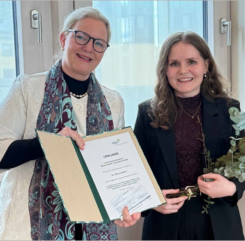 Am 13. Februar 2026 wurde der kbo-Innovationspreis Mental Health | Sozialpsychiatrie feierlich an neun Preistr?gerinnen und Preistr?ger verliehen, darunter Dr. Theresa Halms, Lehrstuhl für Psychiatrie und Psychotherapie der Medizinischen Fakult?t Augsburg. Mit der Auszeichnung würdigen die Kliniken Oberbayern kbo alle zwei Jahre herausragende empirische und praxisbezogene wissenschaftliche Arbeiten im Bereich psychische Gesundheit und Sozialpsychiatrie. Der Preis steht für eine Qualit?tskultur, die Innovation nicht als Selbstzweck versteht, sondern als Motor für konkrete Verbesserungen in der Versorgung. Ausgezeichnet werden Forschungsprojekte, die wissenschaftliche Exzellenz mit hoher Praxisrelevanz verbinden und ihre Erkenntnisse konsequent auf den Versorgungsalltag ausrichten. Gerade angesichts steigender psychischer Belastungen, wachsender gesellschaftlicher Herausforderungen und neuer Anforderungen durch die digitale Lebenswelt braucht es innovative Ans?tze und den engen Austausch zwischen Forschung und Praxis. Die pr?mierten Arbeiten greifen aktuelle Themen auf und zeigen, wie wissenschaftliche Erkenntnisse in konkrete Verbesserungen übersetzt werden k?nnen. Auszug aus der Laudatio: Die Dissertation von Dr. Theresa Halms zu den psychischen Belastungen von Gesundheitsfachkr?ften w?hrend der COVID-19-Pandemie stellt einen wissenschaftlich fundierten und zugleich hoch relevanten Beitrag zur Mental-Health-Forschung dar. Auf der Grundlage eines methodisch anspruchsvollen Mixed-Methods-Ansatzes analysiert die Arbeit differenziert die Belastungssituation verschiedener Berufsgruppen und identifiziert sowohl individuelle Schutzfaktoren als auch strukturelle Barrieren in der Nutzung bestehender Unterstützungsangebote. In besonderer Weise zeigt die Arbeit, dass nachhaltige Entlastung nicht durch kurzfristige oder ausschlie?lich individualbezogene Ma?nahmen erreicht werden kann. Vielmehr unterstreichen die Ergebnisse die Notwendigkeit struktureller Ver?nderungen, praxisnaher Unterstützungsformate und einer systematischen Entstigmatisierung psychischer Belastungen im Gesundheitswesen. Die Dissertation leistet damit einen wichtigen Beitrag zur evidenzbasierten Weiterentwicklung von Unterstützungsstrukturen für Gesundheitsfachkr?fte und besitzt über den pandemischen Kontext hinaus hohe wissenschaftliche und gesellschaftliche Bedeutung. ?