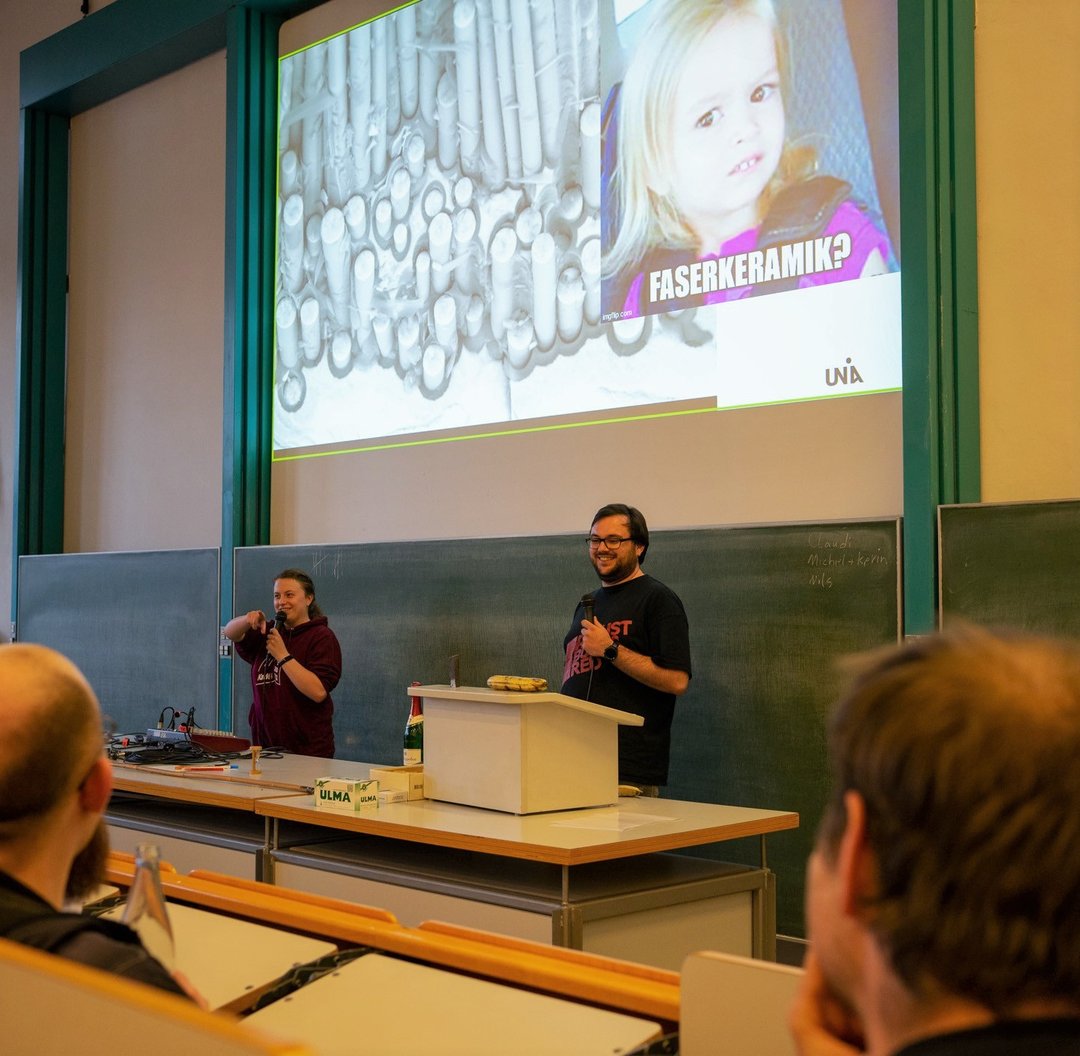 Die beiden Vortragenden des MRM, Michéle Scholl und Kevin Postler, belegten mit ihrem Slam den ersten Platz und gewannen damit die bunte KeLcH (KaWuM eigene Legierung chaotischer Herkunft).