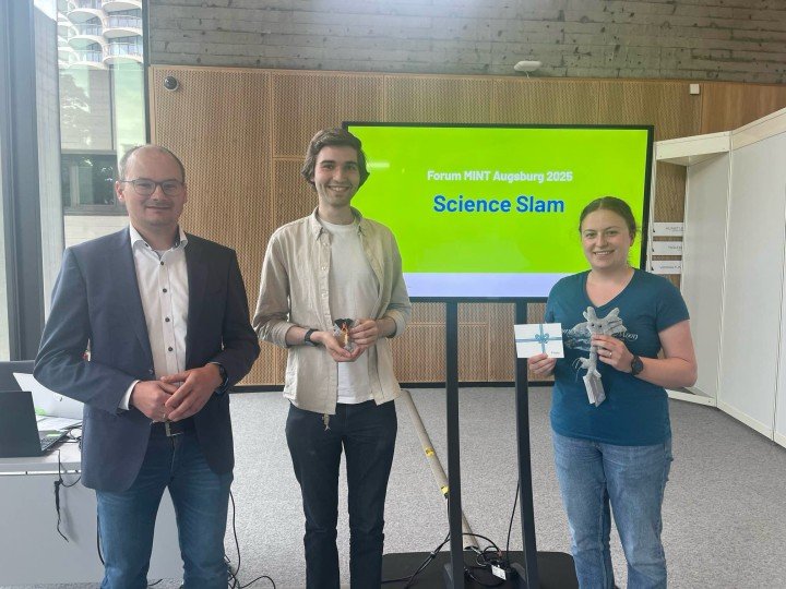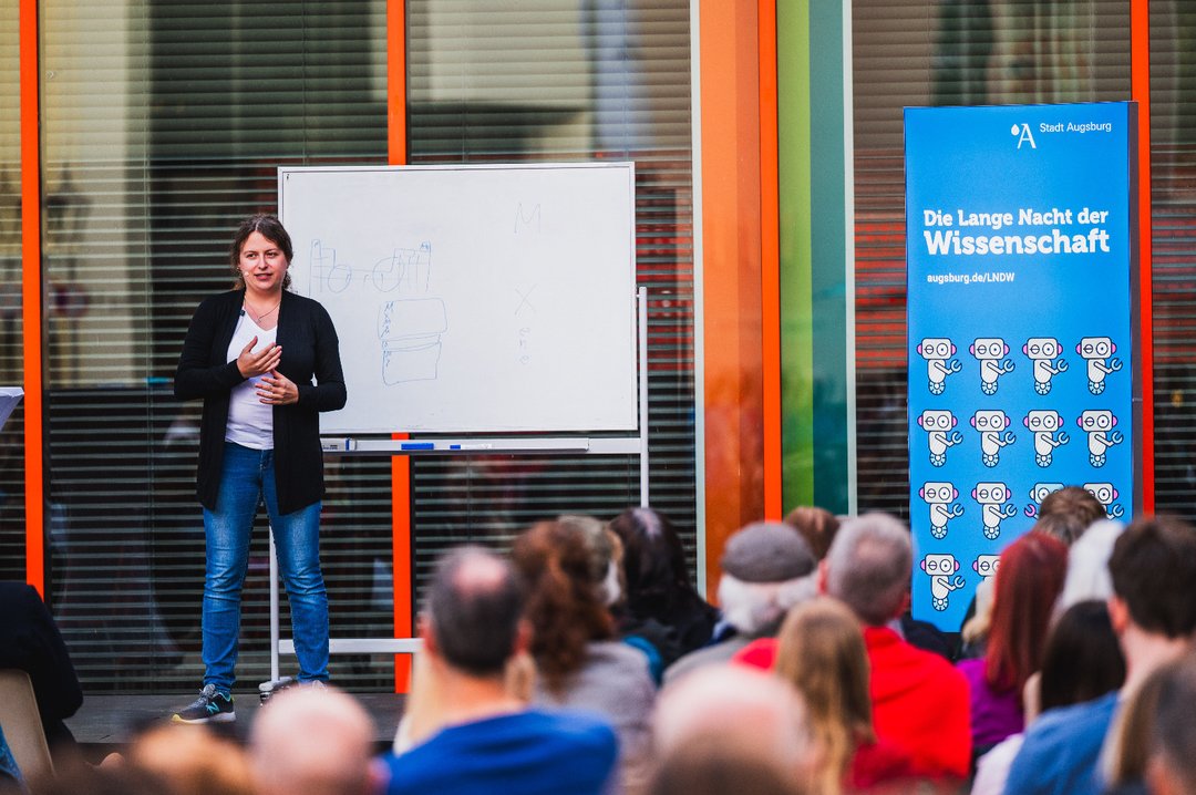 Auch bei der diesj?hrigen Langen Nacht der Wissenschaft der Stadt Augsburg war ein Science Slam der Auftakt für ein buntes Programm aus Vortr?gen und Info-St?nden. Mit Ihrem Slam "MXimal Funktional - Herrscher über das Dimensionale Chaos" konnte Michéle Scholl die ZuschauerInnen nicht nur zum Lachen bringen, sondern auch erkl?ren wie MXene hergestellt werden und warum deren Eigenschaften so interessant sind.