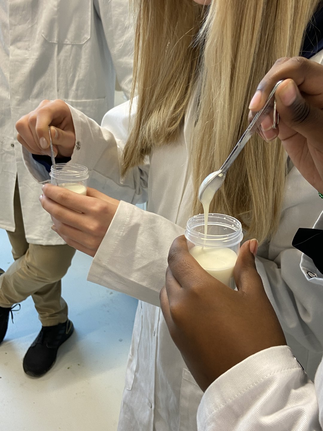 Zus?tzlich zeigten wir den M?dchen ein Experiment mit einer Wasser-St?rke-L?sung, bei dem wir ihnen das Materialverhalten von nicht newtonschen Flüssigkeiten erkl?rten. Das unerwartete Verhalten dieser Mischung eignet sich perfekt für ein kleines Experiment, welches man auch zuhause nachmachen kann.