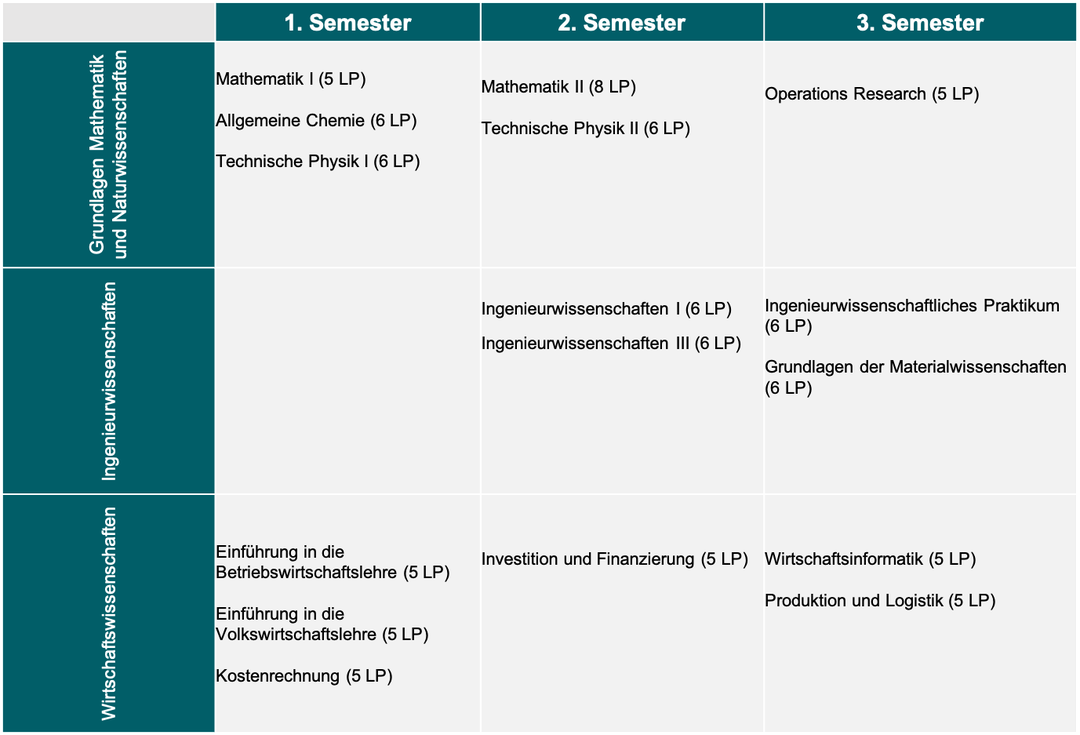Der Grundlagenbereich des Studiums zum Wirtschaftsingenieur gliedert sich in drei Teile: