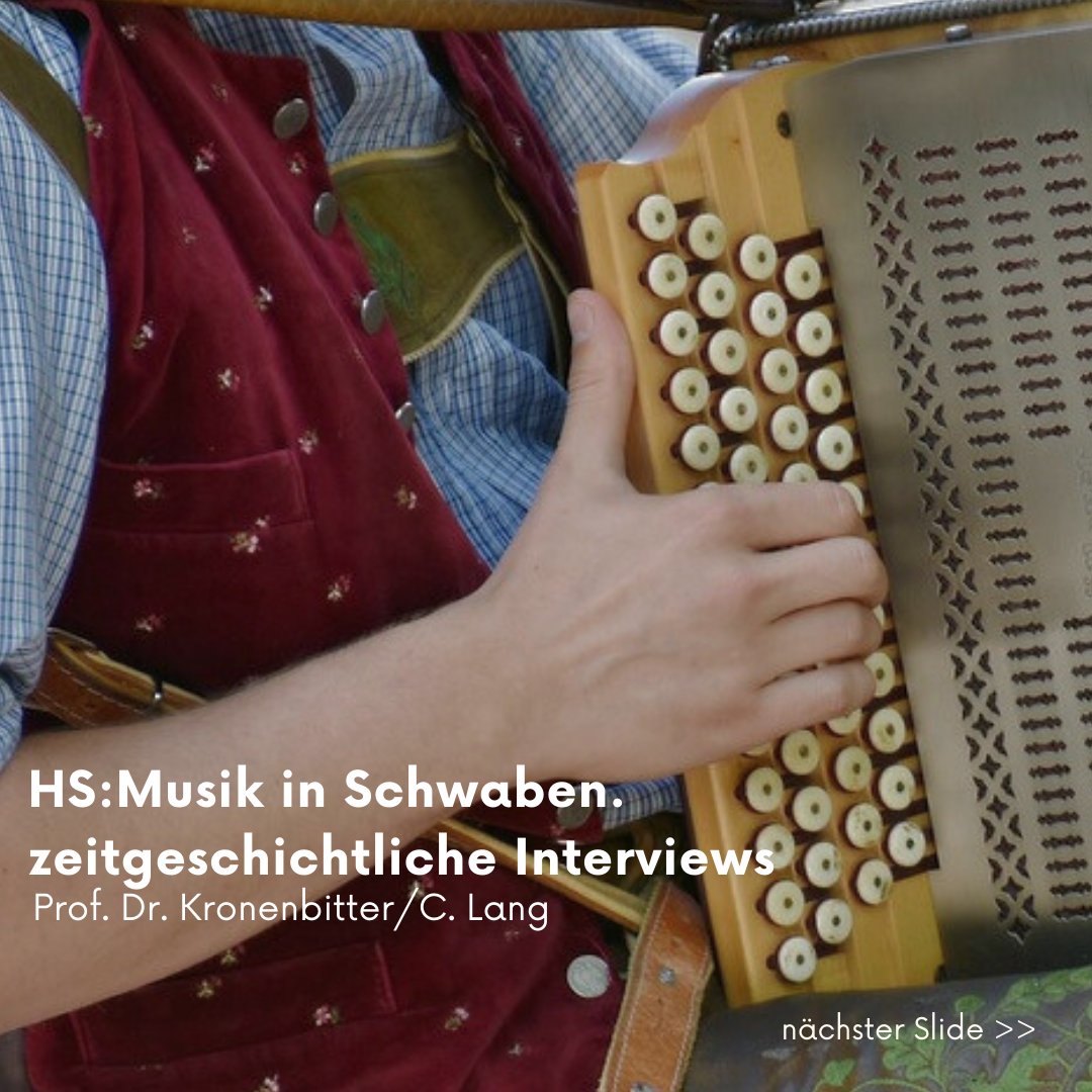 Der Bezirk Schwaben strebt als Daueraufgabe der Bezirksheimatpflege eine Dokumentation der Lebenswelt der Menschen in Schwaben im 20. Jahrhundert an. Ziel ist es, die gesammelten Informationen einer breiten ?ffentlichkeit zur Verfügung zu stellen. Grundlage dieser Dokumentation wird eine Sammlung von Interviews mit Zeitzeug:innen bilden, die für sp?tere Forschungen und Publikationen wissenschaftlich erstellt, erfasst und langfristig gespeichert werden sollen. Seit 2023 finden in Kooperation mit der Bezirksheimatpflege regelm??ig Seminare statt, in denen die Studierenden zeithistorische Interviews vorbereiten, durchführen und auswerten. Die Interviews werden professionell gefilmt und als Dokumente dauerhaft gesichert.