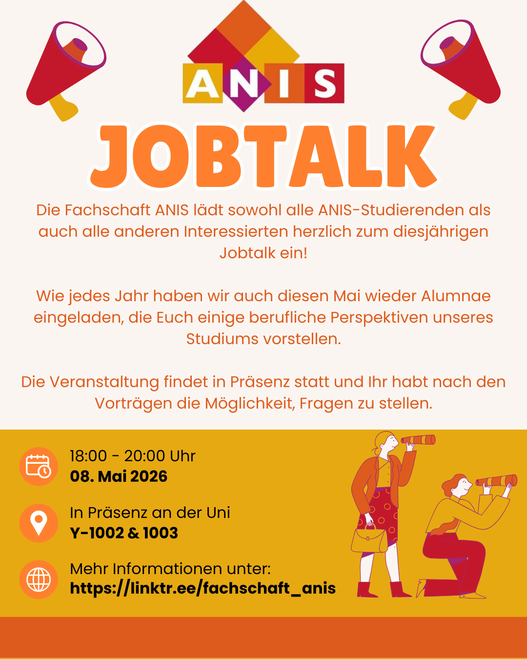 Die Fachschaft ANIS l?dt alle ANIS-Studierende und andere Interessierte herzlich zum diesj?hrigen Jobtalk am 08.05.2026 ein. Dieser wird ab 18:00 Uhr in Raum Y-1002/1003 stattfinden.?