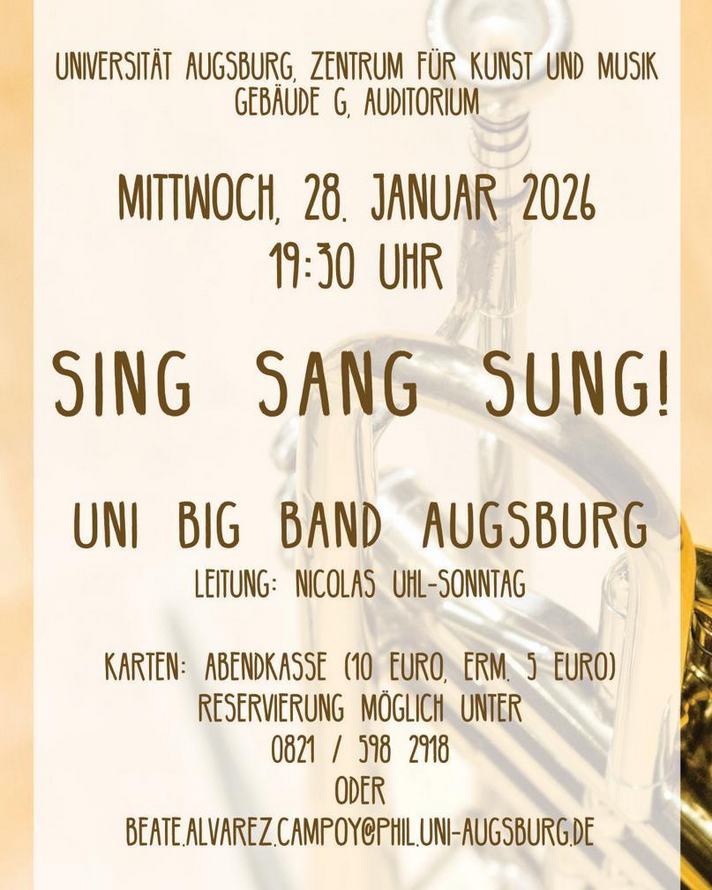 Die Uni Big Band Augsburg (Leitung: Nicolas Uhl-Sonntag) und das Vokalensemble des Lehrstuhls f¨¹r Musikp?dagogik (Leitung: Marlo Honselmann) laden am 28.01.2026 um 19:30 Uhr ins Auditorium des Zentrums f¨¹r Kunst und Musik (Geb?ude G) ein. Titel des gemeinsamen Konzerts: "Sing Sang Sung!"? Eintritt:?10,00 € , erm??igt: 5,00 € ?