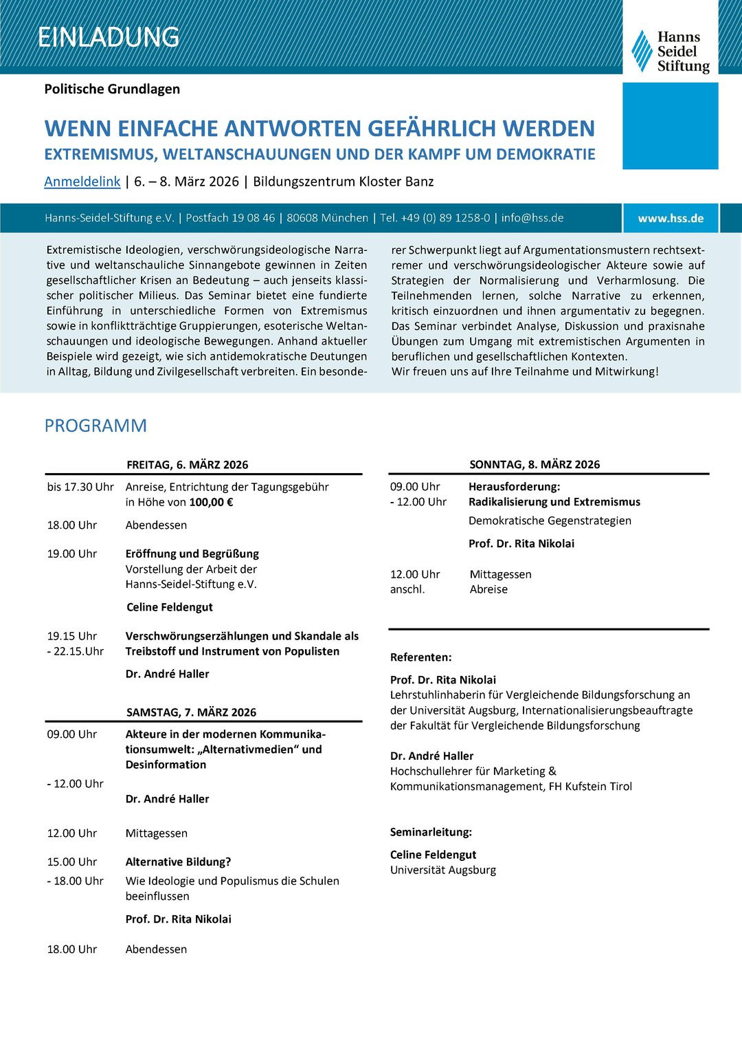 Prof. Rita Nikolai wird in diesem Seminar vom 06.-08.03.2026 im Bildungszentrum Kloster Banz zu den Themen "Alternative Bildung?Wie Ideologie und Populismus die Schulen beeinflussen" und "Herausforderung: Radikalisierung und Extremismus Demokratische Gegenstrategien" referieren. Die Seminarleitung übernimmt Celine Feldengut.