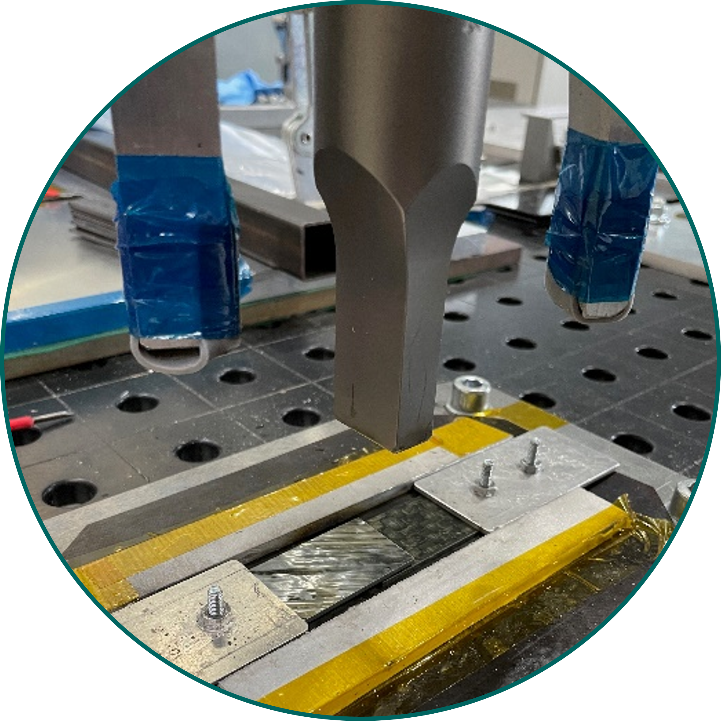 Our chair’s research focus lies on ultrasonic welding as a highly dynamic and efficient joining process for thermoplastic polymers and fiber-reinforced composite materials. The process is characterized by very short cycle times, localized heat input, and a high potential for automation, making it particularly attractive for industrial applications with strict requirements regarding process reliability and reproducibility.
