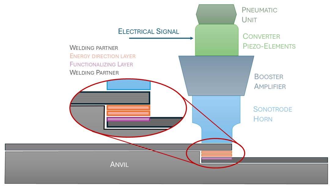An electrical signal is converted into high-frequency mechanical vibration within the converter using piezoelectric elements. The vibration is then adjusted and amplified in amplitude by a booster (amplifier). Finally, the ultrasonic vibration is transmitted into the joining partners and directed into the weld zone via the horn (sonotrode). A stable anvil is required as a supporting tool in order to apply the necessary forces to the joining partners while preventing deformation of the final component and ensuring dimensional stability. A pneumatic unit applies a defined static force on the whole setup to ensure a good and constant contact between sonotrode and the welding material.?