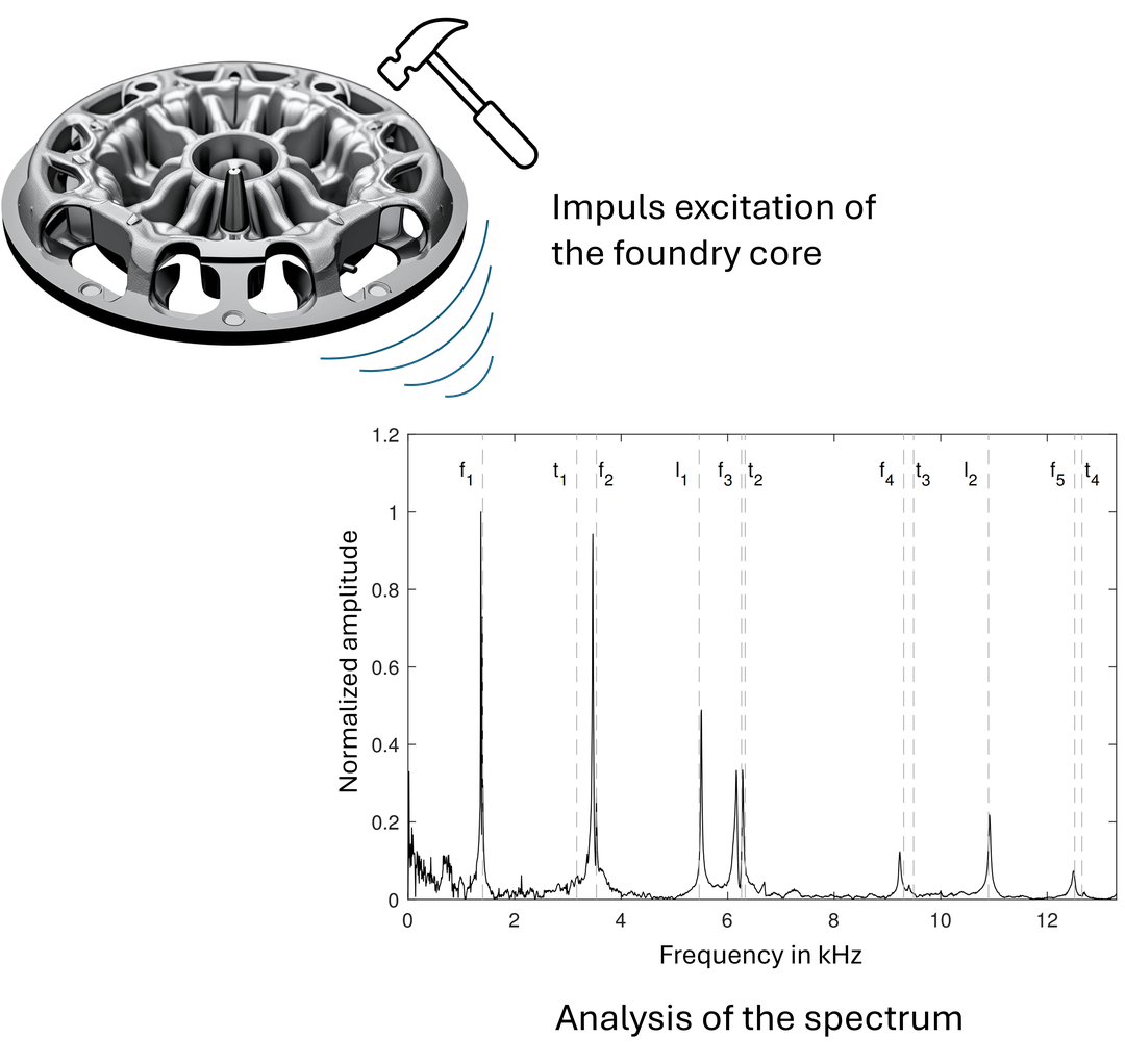 For foundry cores, there is no quality assurance method suitable for series production that can find hidden cracks that occur during storage. Therefore, a test setup is being developed that enables the cores to be tested by the non-destructive impulse excitation method. The resulting acoustic data is analyzed in the frequency range using machine learning methods in order to detect defects.