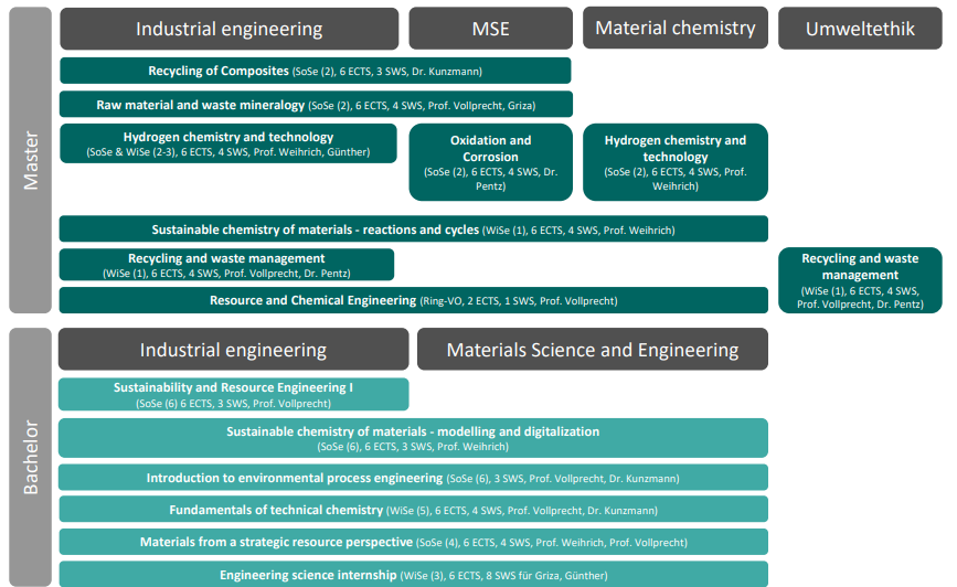 The chair offers courses for the degree programs Industrial Engineering and Management (WING), Materials Science, Materials Science and Engineering (MSE), Materials Chemistry and, if interested, also for students of environmental science degree programs. Registration for the courses takes place via Digicampus.