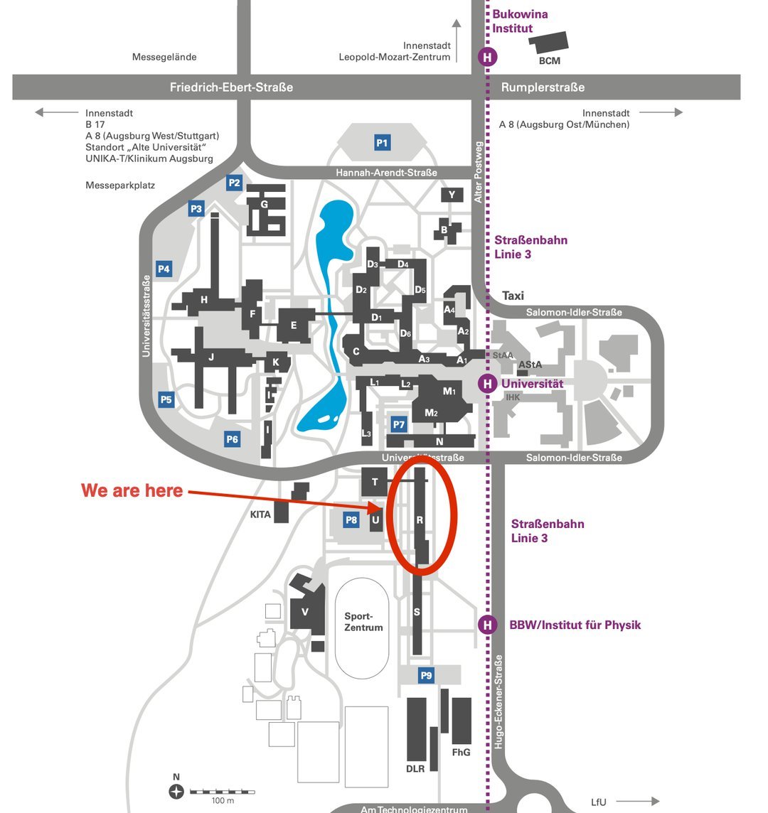 Tram line 3, from the city center or main train station in the direction of “Inninger Stra?e P+R” or “K?nigsbrunn Zentrum” to tram stop “Universit?t” or "Institut für Physik". We are in the northern part of building R on level 3 (3rd floor).