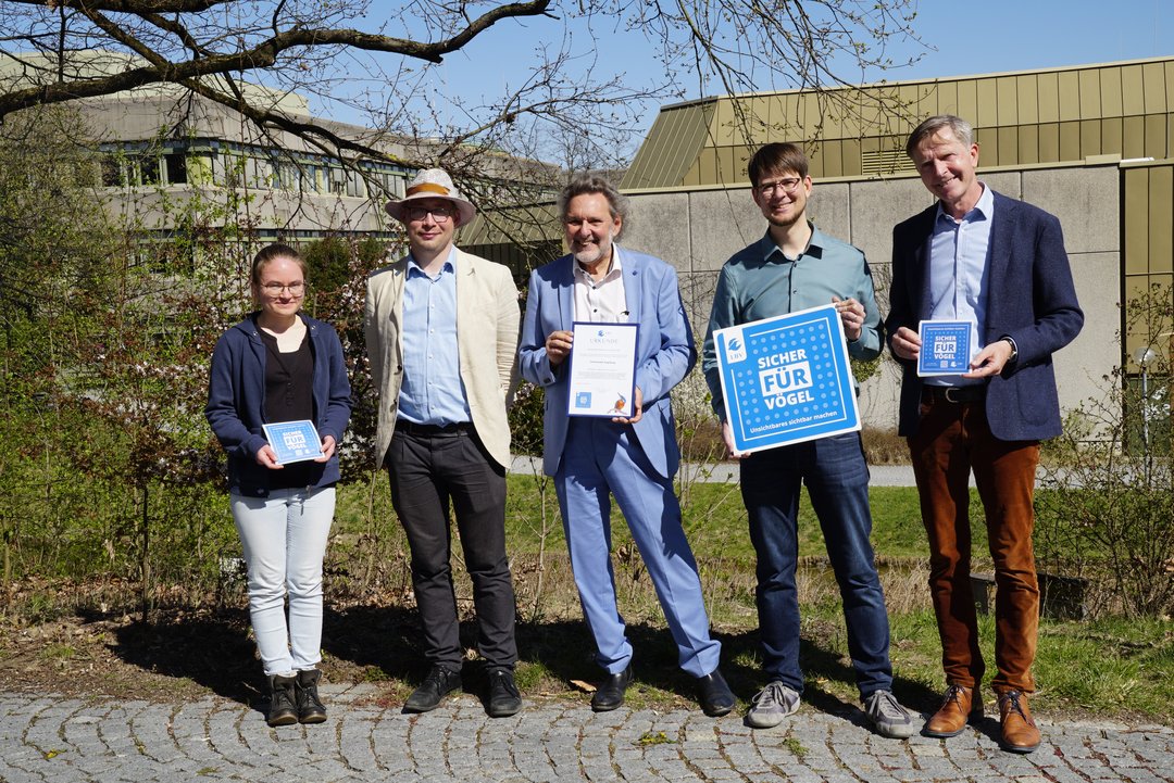 Die Universit?t Augsburg ist am Mittwoch, 8. April 2026, vom Landesbund für Vogel- und Naturschutz in Bayern e.V. (LBV) mit der Plakette ?Vogelfreundliche Glasfl?che“ ausgezeichnet worden. Damit würdigte der Verband den Einsatz der Universit?t für mehr Vogelsicherheit auf dem Campus. In den Jahren 2024 und 2025 wurden dort bereits rund 1.500 Quadratmeter Glasfl?chen mit hohem Vogelschlagrisiko vogelschutzgerecht entsch?rft. Die Ma?nahmen sind Teil der langj?hrigen Aktivit?ten der Universit?t Augsburg im Bereich Biodiversit?t und Naturschutz. Der park?hnliche Campus ist nicht nur ein Ort des Lernens und Forschens, sondern auch Lebensraum für zahlreiche Vogelarten. Um diesen Lebensraum zu erhalten und weiter zu verbessern, setzt die Universit?t auf verschiedene Schutzma?nahmen und m?chte zugleich Studierende und Mitarbeitende für den Vogelschutz sensibilisieren. ? Nachgerüstet wurden bislang unter anderem Verbindungsbrücken zwischen dem Geb?ude D der Geisteswissenschaften und der Zentralbibliothek (Geb?ude E) sowie zwischen der Zentralbibliothek und der Teilbibliothek Sozialwissenschaften (Geb?ude F). Darüber hinaus wurden bereits bekannte Gefahrenstellen am Erweiterungsbau Geistes- und Sozialwissenschaften (Geb?ude Y) sowie an Fassaden der Foyerbereiche des Gro?en H?rsaalzentrums (Geb?ude C) und des H?rsaalzentrums Physik (Geb?ude T) bearbeitet. Zum Einsatz kam eine wissenschaftlich geprüfte, hochwirksame Vogelschutzfolie im 9/90-Millimeter-Raster. Sie bewirkt, dass Glasfl?chen für V?gel als Hindernis besser wahrnehmbar sind, wodurch das Risiko von Kollisionen nachweislich um bis zu 90% verringert wird. Die heute verwendeten Punktmuster haben sich im Test als weitaus wirksamer erwiesen als die herk?mmlichen Greifvogel-Silhouetten. ? Die Glasfl?chenbeklebung ist Teil eines gr??eren Engagements für den Vogelschutz auf dem Campus. In den vergangenen Jahren wurden unter anderem neue Nistk?sten für Singv?gel und Flederm?use angebracht sowie ein Taubenhaus auf Geb?ude D eingerichtet, das ehrenamtlich in Kooperation mit dem Tierschutzverein Augsburg betreut wird. Auch für Greifv?gel wurden zus?tzliche Nistm?glichkeiten geschaffen: Auf der Universit?tsbibliothek brütet seit mehreren Jahren ein Turmfalkenpaar; ein weiterer Falkenkasten wurde bereits installiert. ? Im Jahr 2024/25 wurde auf dem Campus in Kooperation mit dem Bayerischen Landesamt für Umwelt eine Brutvogelkartierung durchgeführt, die im Frühjahr 2025 abgeschlossen wurde. Die Untersuchung führte die Geographie-Studentin Laura Lacher im Rahmen ihrer Bachelorarbeit durch. Sie konnte zeigen, dass der Campus der Universit?t Augsburg Lebensraum für 33 Vogelarten ist. Insgesamt konnten 277 Brutpaare nachgewiesen werden. Hinzu kommen zahlreiche Arten, die zwar nicht brüten, aber als G?ste die Vielfalt der Lebensr?ume auf dem Campus zu sch?tzen wissen. ?Vogelschutz ist für uns kein Einzelprojekt, sondern Teil eines umfassenden Verst?ndnisses von nachhaltiger Campusentwicklung. Die Auszeichnung zeigt, dass wir auf diesem Weg bereits wichtige Schritte gegangen sind – und sie best?rkt uns darin, die Ma?nahmen konsequent weiterzuführen“, sagt Prof. Dr. Axel Tuma, Vizepr?sident für Internationalisierung und Nachhaltigkeit der Universit?t Augsburg. Die bisherigen Arbeiten sollen nicht die letzten bleiben. Grundlage für weitere Schritte ist eine derzeit laufende Bewertung des Vogelschlagrisikos an Geb?uden auf dem Campus. Auf dieser Basis sollen auch künftig weitere Glasfl?chen mit hohem Anflugrisiko entsch?rft werden. ? ?Die Nachrüstungen an der Universit?t Augsburg sind in dieser Gr??e in Bayern einzigartig“, sagt der Projektmanager des LBV-Projektes ?Unsichtbares sichtbar machen – Reduzierung von Vogelschlag an Glas“, Dr. Peter Stimmler bei der Verleihung der Plakette. ?Ein artenreicher Campus entsteht nicht von selbst. Er braucht geeignete Lebensr?ume, kontinuierliche Pflege und Schutzma?nahmen, die ?kologische Verantwortung praktisch umsetzen“, sagt Prof. Dr. Jens Soentgen vom Wissenschaftszentrum Umwelt (WZU) der Universit?t Augsburg. Schlüssel sei die exzellente Kooperation mit engagierten und kompetenten Kollegen in der Verwaltung sowie mit den Fachleuten vom Landesamt für Vogelschutz und vom Landesbund für Vogelschutz. Die Plakette wurde am 8. April 2026 vor der Zentralbibliothek der Universit?t Augsburg durch Dr. Peter Stimmler vom Landesbund für Vogel- und Naturschutz in Bayern e.V. überreicht. Anwesend war u.a. auch der Vorsitzende der Kreisgruppe Augsburg des Landesbundes für Vogelschutz, Dr. Martin Trapp. Für die Universit?t Augsburg nahm Prof. Dr. Axel Tuma die Auszeichnung entgegen. Er dankte allen an den Ma?nahmen Beteiligten und betonte, dass die Universit?t auf das bislang Erreichte stolz sein k?nne. Zu Beginn der Veranstaltung ordnete Prof. Dr. Jens Soentgen vom WZU die Ma?nahmen in den gr??eren Zusammenhang von Vogelschutz und Biodiversit?tsf?rderung an der Universit?t ein und stellte die beteiligten Akteurinnen und Akteure vor. Stefan Kreidenweis, Energiemanager und Vertreter des Referats für Bau und Technik, gab Einblicke in die praktische Umsetzung der baulichen Ma?nahmen. Laura Lacher, Masterstudentin an der Universit?t Augsburg, stellte zudem Ergebnisse ihrer auf dem Campus durchgeführten Vogelkartierung vor. tb ?