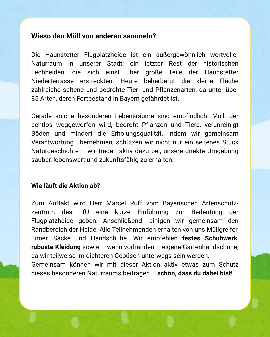 Die Flugplatzheide ist ein Stück Natur, das in Augsburg seinesgleichen sucht. Sie ist das lebendige Relikt einer Landschaft, die früher gro?e Teile der Region pr?gte. Heute steht sie nicht nur für Artenreichtum, sondern auch für die Frage, wie wir mit den wertvollen Grünfl?chen in unserer Stadt umgehen wollen. Wir haben die Chance, selbst Verantwortung zu übernehmen und einen sichtbaren Beitrag zu leisten. Mit unserer gemeinsamen Aktion m?chten wir genau das tun: ein Zeichen setzen. Es geht dabei nicht nur um das Aufr?umen, sondern darum, zu zeigen, dass uns dieser Ort wichtig ist - als Naturfl?che oder Erholungsraum.