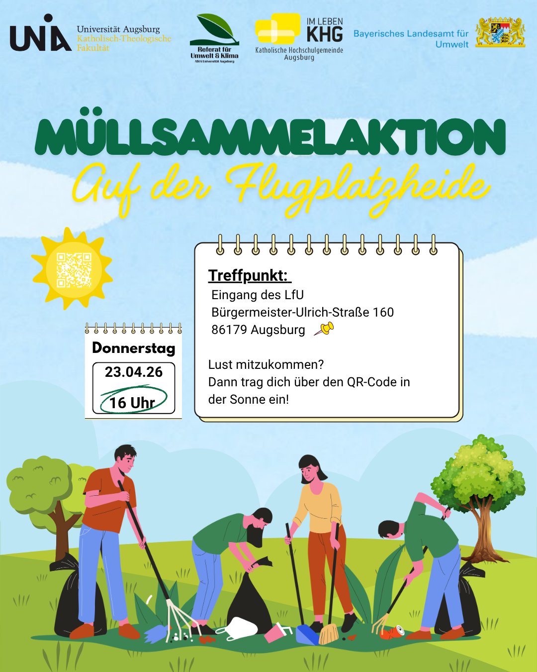 Am 23.04.26 findet ab 16 Uhr eine gemeinsame Müllsammelaktion auf der Flugplatzheide hinter dem Bayerischen Landesamt für Umwelt statt. Die Initiative wird vom Studiengang Umweltethik der Universit?t Augsburg in Kooperation mit dem Bayerischen Landesamt für Umwelt, dem ASTA?Referat für Umwelt und Klima sowie dem Umweltarbeitskreis der Katholischen Hochschulgemeinde durchgeführt.