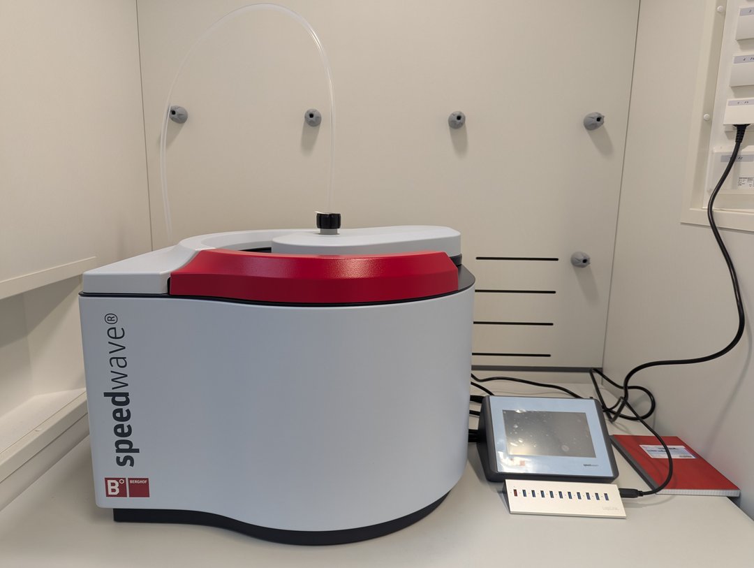 Mittels mikrowellenbasiertem Druckaufschluss k?nnen feste organische und anorganische Materialien zersetzt und aufgeschlossen werden. Durch die direkte Erhitzung der Aufschlussl?sung in einem geschlossenen Gef?? k?nnen Temperaturen oft weit oberhalb des herk?mmlichen Siedepunktes erreicht werden, so dass diese Aufschlusstechnik einen hohen Zeitvorteil erreicht. Die Aufschlussl?sungen k?nnen mittels weiterführender Analytik z.B. ICP-OES auf ihre Elementgehalte hin untersucht werden. Dieses Ger?t wird im Rahmen der institutsweiten Zentrallabore gemeinschaftlich genutzt.