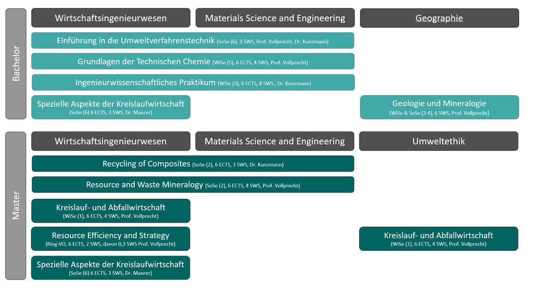 Der Lehrstuhl bietet Lehrveranstaltungen für die Studieng?nge Wirtschaftsingenieurwesen (WING), Materials Science, Materials Science and Engineering (MSE), Materialchemie sowie bei Interesse auch für Studierende umweltwissenschaftlicher Studieng?nge an. Die Anmeldung zu den Lehrveranstaltungen erfolgt über den Digicampus.