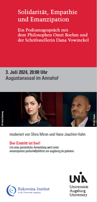 03. Juli 2024 (20 Uhr): Podiumsgespr?ch im Annahof, Augustanasaal zum Thema ?Solidarit?t, Empathie und Emanzipation“ mit dem Philosophen Omri Boehm und der Autorin Dana Vowinckel, moderiert von Shira Miron und Hans-Joachim Hahn