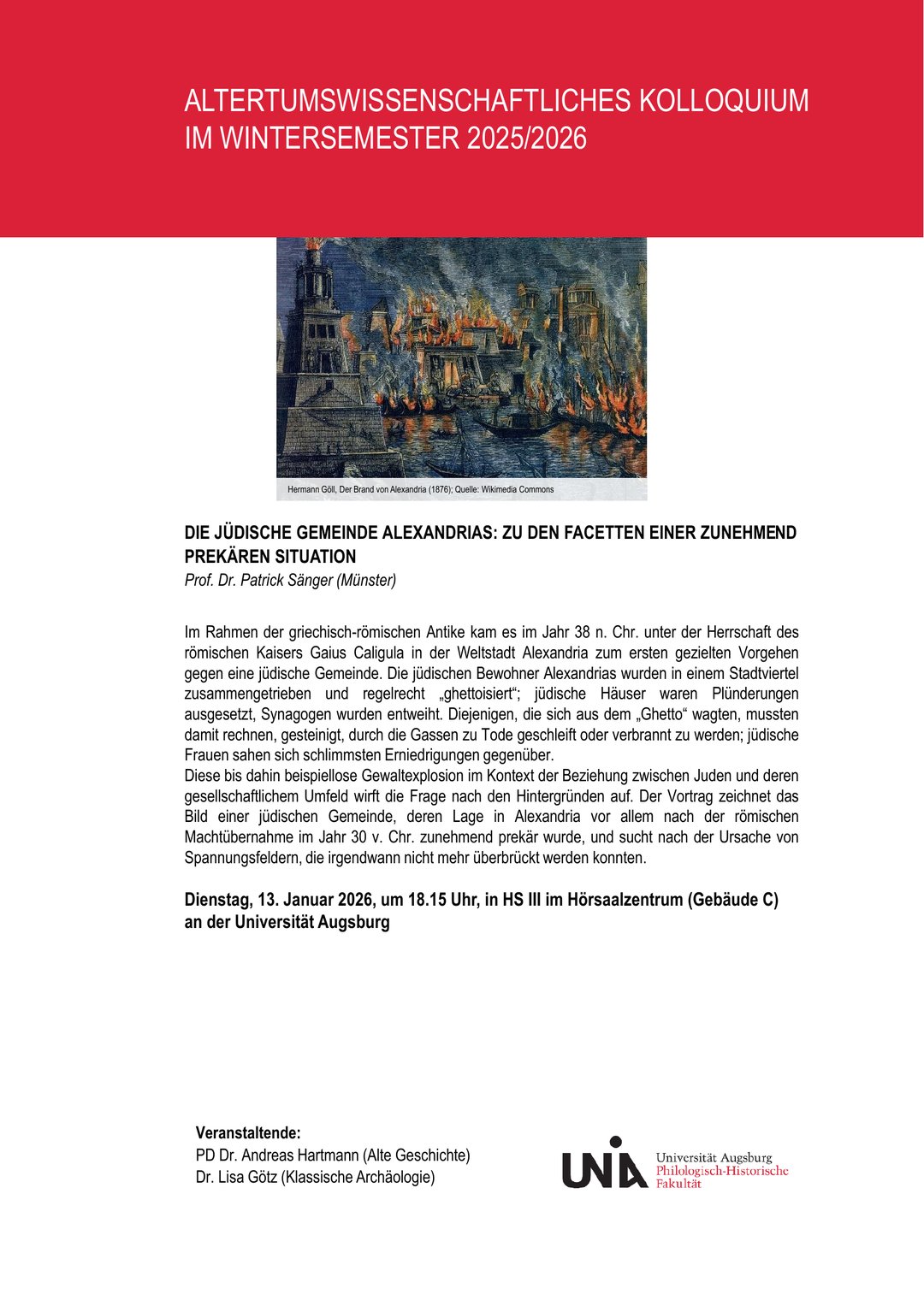 Das Winterprogramm der Alten Geschichte und Klassischen Arch?ologie an der Universit?t Augsburg. ? Der Gestank der Gro?stadt. Zur olfaktorischen und moralischen Bewertung urbaner Kultur in der r?mischen Kaiserzeit 18.11.2025 Die R?mer waren schmutzig! Leben am Meer. Dimensionen und Herausforderungen antiker Hafenst?dte Die jüdische Gemeinde Alexandrias: zu den Facetten einer zunehmend prek?ren Situation Auspr?gung und Entwicklung der Lebensmittelversorgung der antiken Metropole Ephesos Materielle Realit?ten einer antiken Metropole: Wasserversorgung und Quartiersbildung im punischen und r?mischen Karthago Johannes Chrysostomos und Antiochia am Orontes?– der christliche Blick auf eine Metropole der Sp?tantike ? ? N?chster Vortrag am 13.1.2026?in H?rsaal III in Geb?ude C, Universit?t Augsburg: ? ? Allgemeine Hinweise zur Durchführung: ? ? Mit herzlichen Grü?en ?