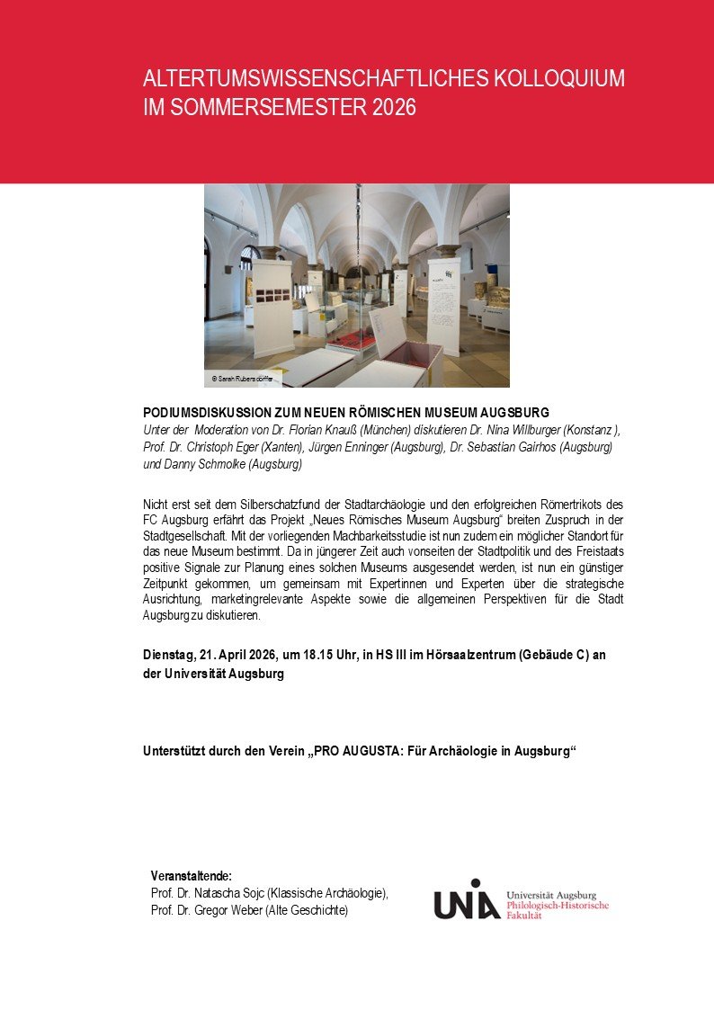 Das Sommerprogramm der Alten Geschichte und Klassischen Arch?ologie an der Universit?t Augsburg. ? Podiumsdiskussion zum neuen r?mischen Museum Augsburg 5.5.2026 Caesar in Meninx. Ein Neufund und seine Folgen Eine Kulturgeschichte der Pilze in der griechisch-r?mischen Antike. Perspektiven für ein neues Forschungsfeld Entanglement und empire. Gedanken zu einer Verflechtungsgeschichte AfroEurasiens in vorhellenistischer Zeit Das Gymnasium von Agrigent: Neue Funde und Forschungen Men (and Women) at Work: Lives of Roman Builders St?dtische Wasserversorgung und r?mische Verwaltung im kaiserzeitlichen Kleinasien ? ? N?chster Vortrag am 21.4.2026?in H?rsaal III in Geb?ude C, Universit?t Augsburg: ? ? Allgemeine Hinweise zur Durchführung: ? ? Mit herzlichen Grü?en Prof. Dr. Natascha Sojc (Klassische Arch?ologie), ?