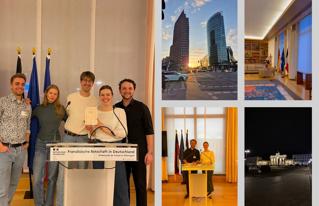 Mit Erfolg diskutierten, debattierten Jael Haar und Valentin Andrieux und vertraten die Universit?t Augsburg in der Jury der Choix Goncourt de l'Allemagne in Berlin, begleitet von Felicitas Ammermann und Moritz Kamla, die auch an der réception de choix?in der franz?sischen Botschaft teilnehmen konnten.