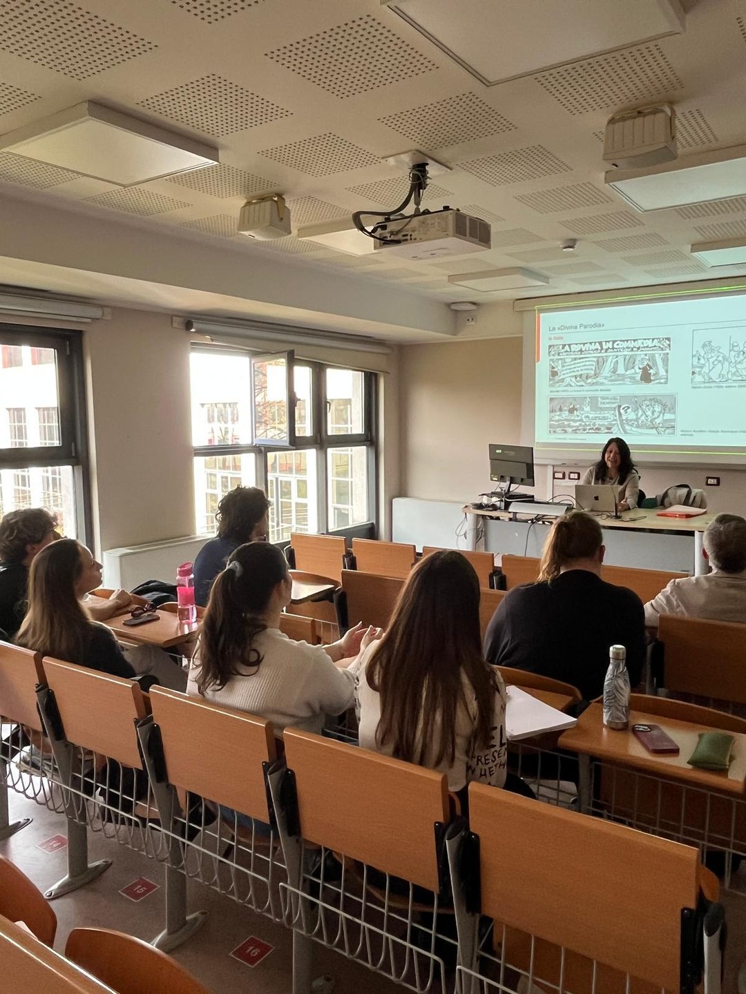 Vom 16. bis zum 21. M?rz war Prof. Dr. Daniela Pietrini (Romanische Sprachwissenschaft) als Visiting Professorin an der Universit?t Verona zu Gast. Im Rahmen ihres Aufenthalts führte sie ein Blockseminar zu den Besonderheiten der italienischen Sprache in Comics und Graphic Novels durch, das in erster Linie für die Masterstudierenden des binationalen Studiengangs ?Europ?ische Kommunikationskulturen – Italienisch“ der Universit?ten Augsburg und Verona konzipiert war. Darüber hinaus nahmen auch interessierte Studierende aus weiteren Masterstudieng?ngen der Universit?t Verona teil, was zu einem intensiven fachlichen Austausch in einer interdisziplin?ren Gruppe beitrug. Inhaltlich behandelte das Seminar zentrale Aspekte der Comicforschung und der italienischen Sprachwissenschaft. Im Fokus standen die Beziehungen zwischen Text und Bild, die spezifischen Formen der Inszenierung von Mündlichkeit sowie die Adaptation kanonischer Werke der italienischen Literatur in Comicform, mit besonderer Aufmerksamkeit für das ?Inferno“ von Dante. Darüber hinaus wurde die Rolle der Comics in der italienischen Sprachgeschichte des 20. Jahrhunderts thematisiert. Die Gastprofessur wurde durch die DAAD-F?rderung des Studiengangs erm?glicht, die darauf abzielt, den Austausch zwischen den Partneruniversit?ten nicht nur auf Ebene der Studierenden, sondern auch im Bereich der Lehre und Forschung zu intensivieren. Neben der Lehrt?tigkeit nutzte Prof. Pietrini ihren Aufenthalt in Verona auch für Gespr?che mit den dortigen Kolleginnen und Kollegen sowie für den Austausch mit den aktuellen Studierenden des Studiengangs. Diese werden im kommenden Herbst ihrerseits einen Studienaufenthalt an der Universit?t Augsburg absolvieren. ?