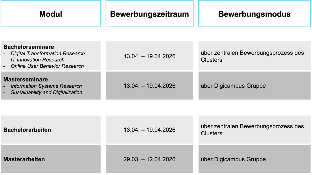 der Lehrstuhl für Information Systems und Management bietet in diesem Semester Informationsveranstaltungen zu Seminar- und Bachelorarbeiten an.