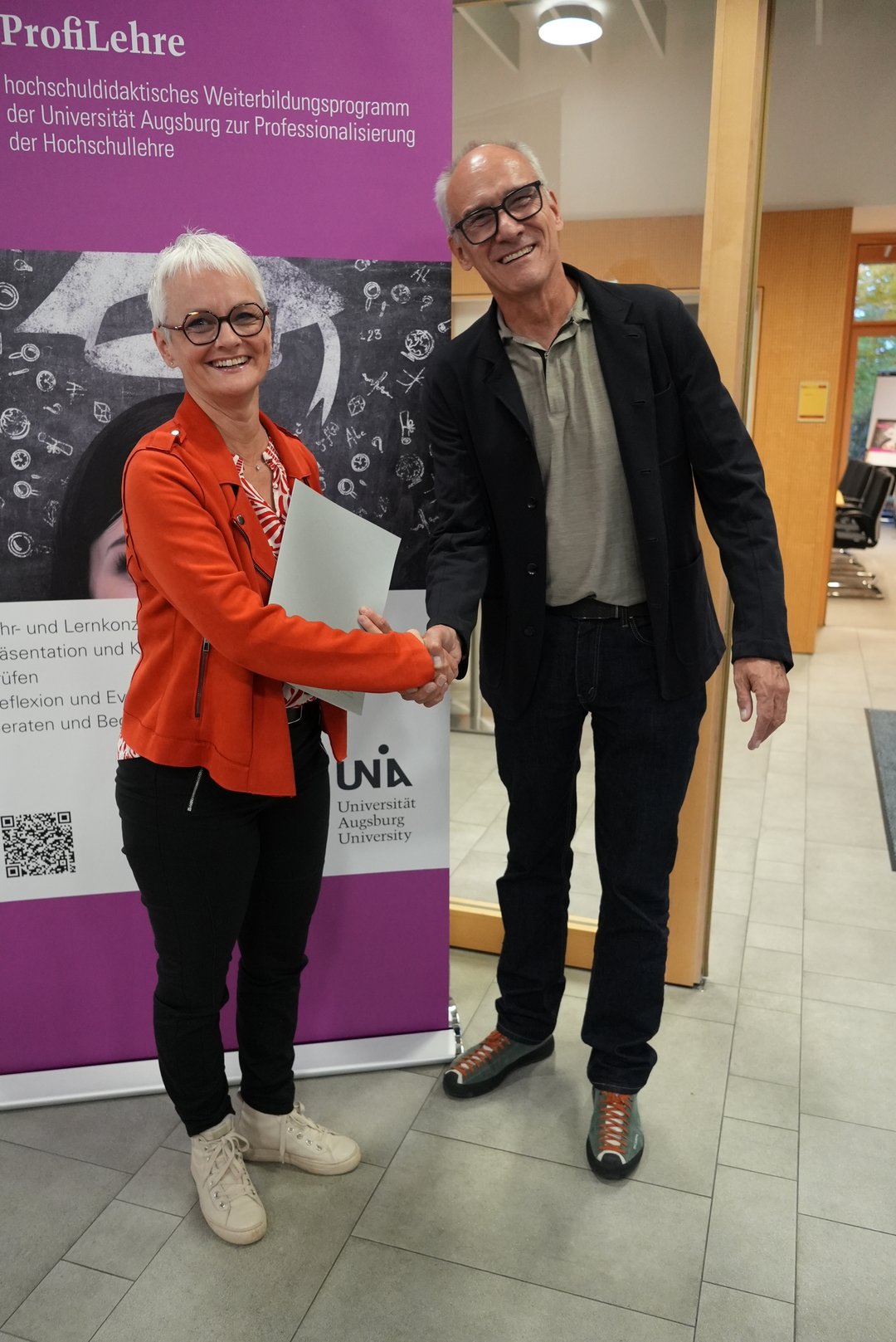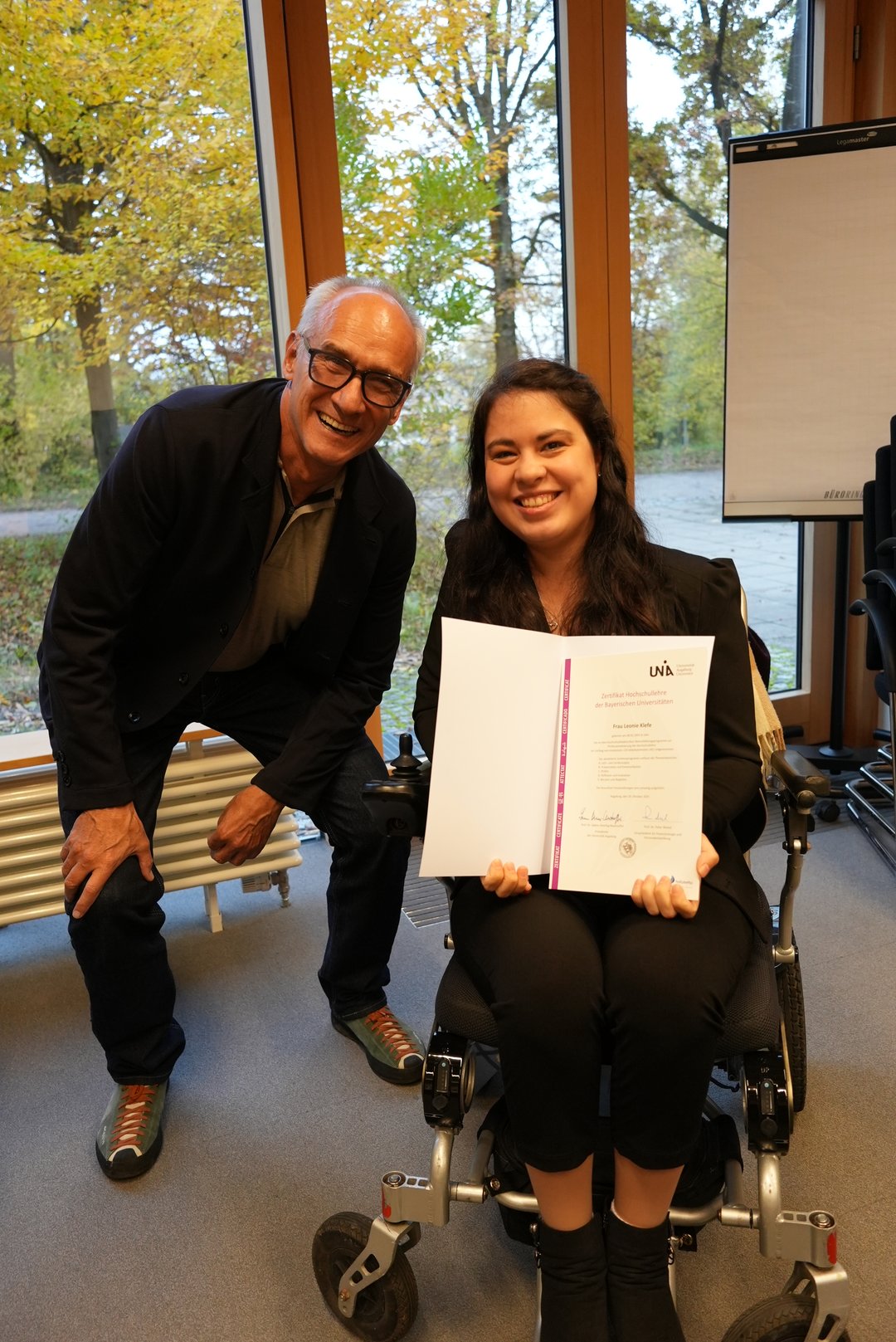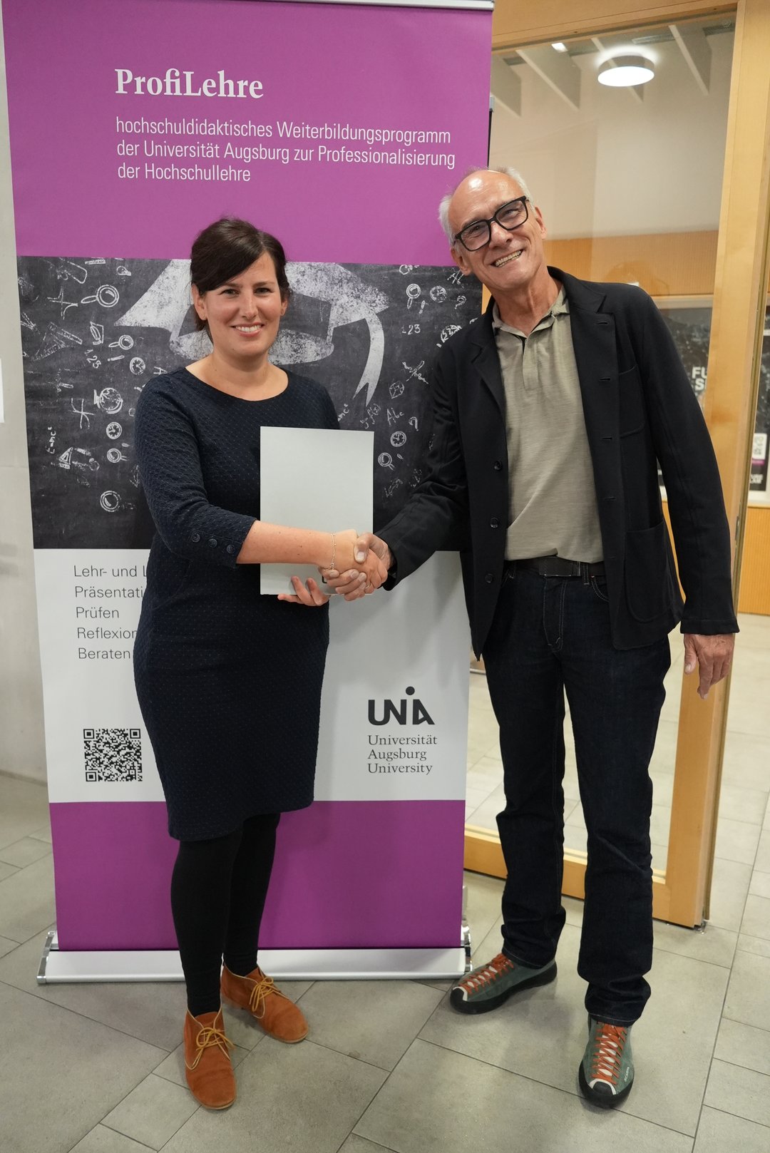 ? Vierzehn Zertifikate Hochschullehre der Bayerischen Universit?ten?und vier?Vertiefungsstufenzertifikate?überreichte?Herr Vizepr?sident, Prof. Dr. Peter Welzel an Hochschullehrerinnen und -lehrer der Universit?t Augsburg. Seit dem Sommersemester 2020 wurden insgesamt 235 Zertifikate Hochschullehre der Bayerischen Universit?ten und 156?Zertifikate für inklusive Hochschullehre erworben.?Ein wichtiger Beitrag zur Professionalisierung der Hochschullehre. ? ? ? ? Zehn Zertifikate für inklusive Hochschullehre überreichte Herr Prof. Dr. Bernd Oberdorfer,?Beauftragter für Studierende mit Beeintr?chtigung.? ?
