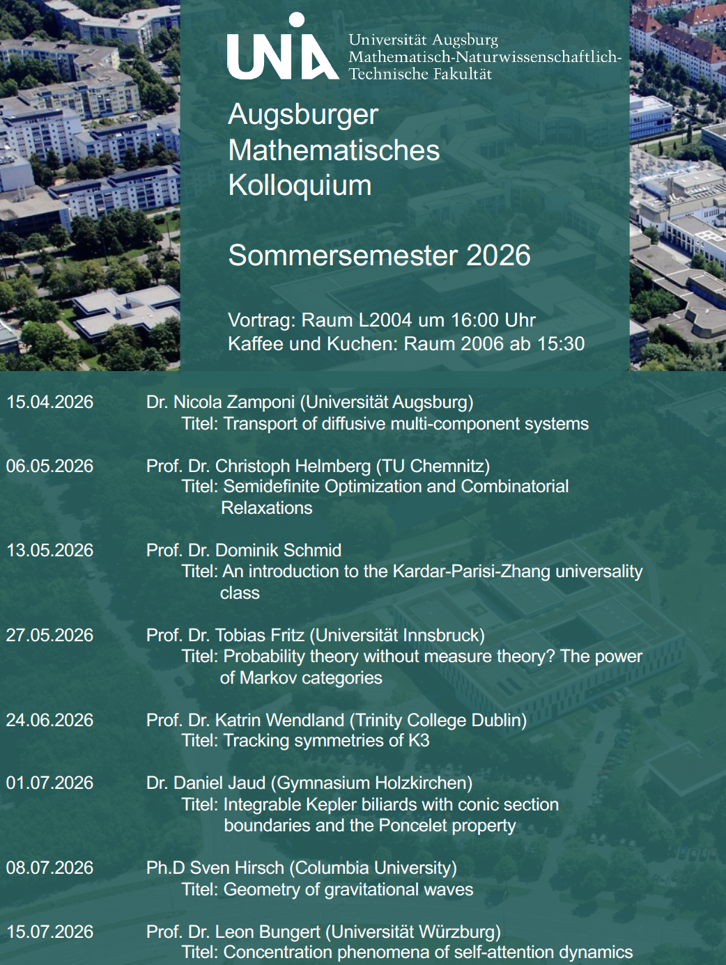 Das Augsburger mathematische Kolloquium ist eine Veranstaltung des Instituts für Mathematik mit dem Ziel, herausragende Sprecherinnen und Sprecher für Vortr?ge zu gewinnen, die für ein breites mathematisches Publikum zug?nglich sind. Vor den eigentlichen Vortr?gen gibt es bei Kaffee und Kuchen die M?glichkeit, sich bereits vorab mit der oder dem Vortragenden auszutauschen.
