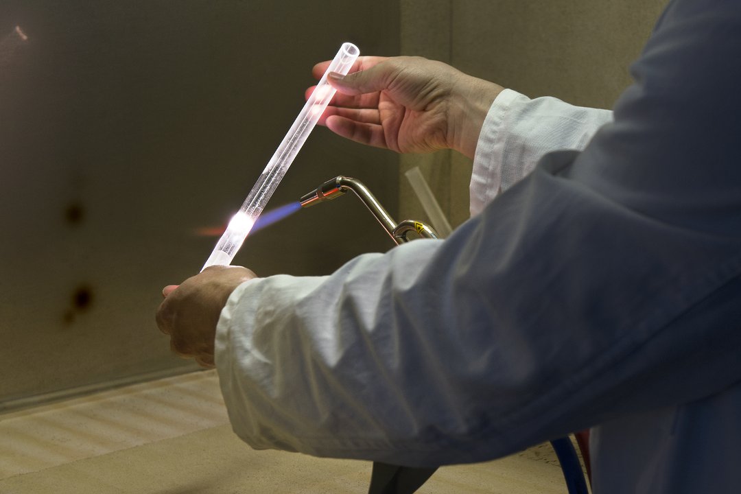 A hydrogen-oxygen torch is used to seal quartz ampoules. The samples can be sealed under vacuum or argon in order to avoid oxidation. A vacuum line allows pumping on four ampoules simultaneously. Quartz ampoules are used at temperatures of up 1200°C. The torch is set up in a fume hood in order to prevent inhalation of crystalline silica dust.