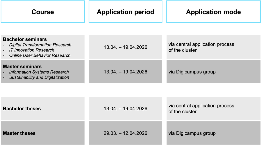 Please note the following registration and application periods as well as dates for the courses of the Chair of Information Systems and Management.